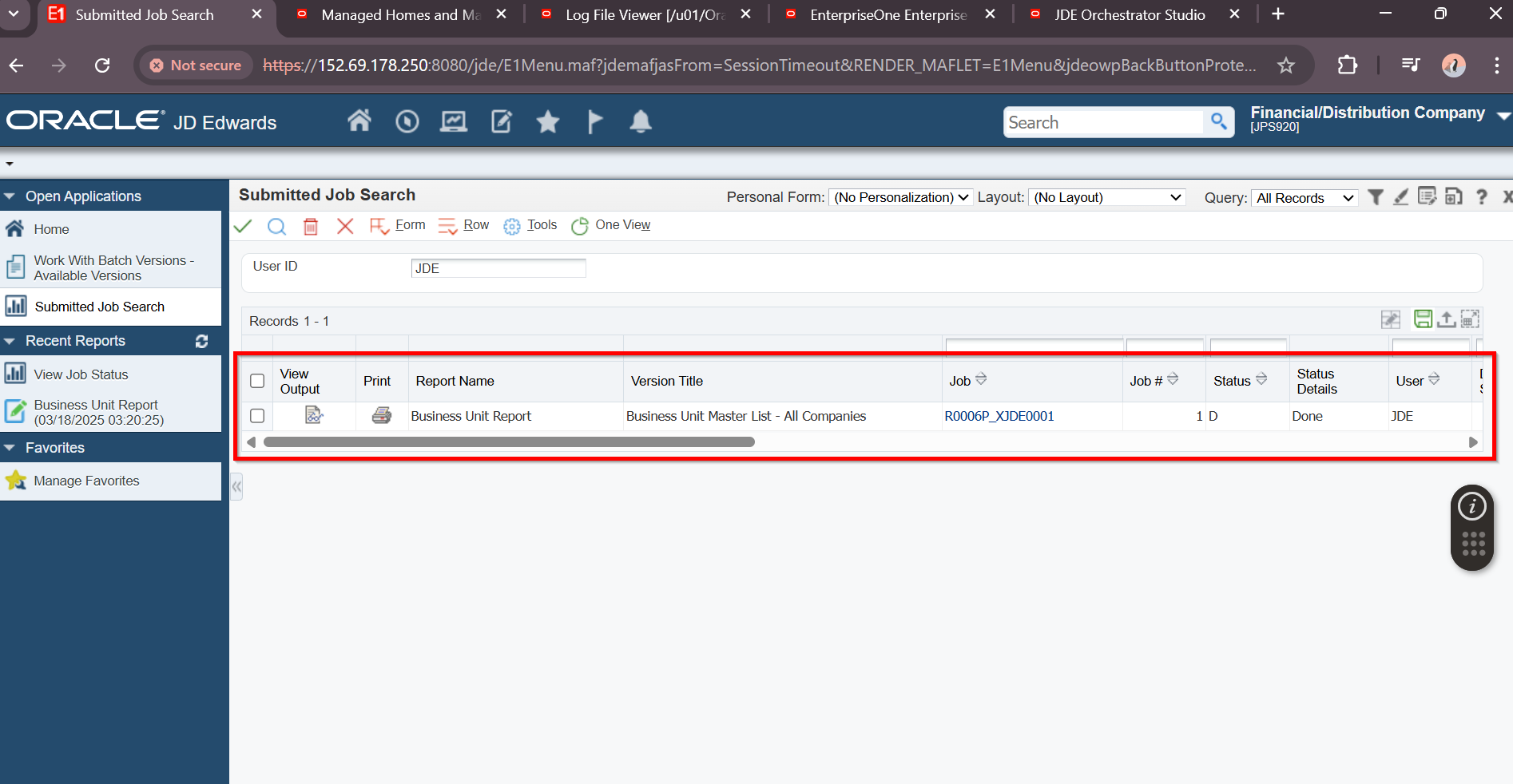Status jdeAdminServer : Server is Running ( PID#: 59497 | Port#: 7005 | Port Status: UP )