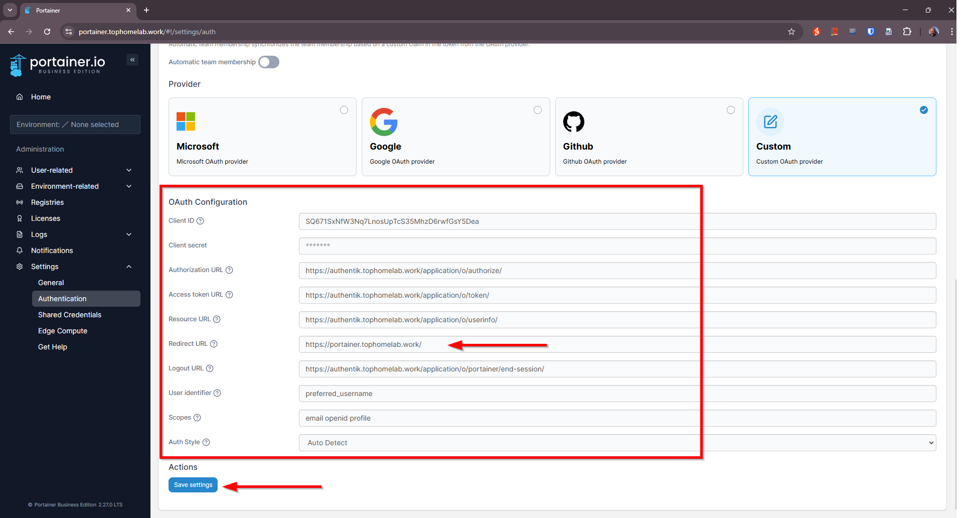 Set OAuth configuration from Authentik and select Save settings