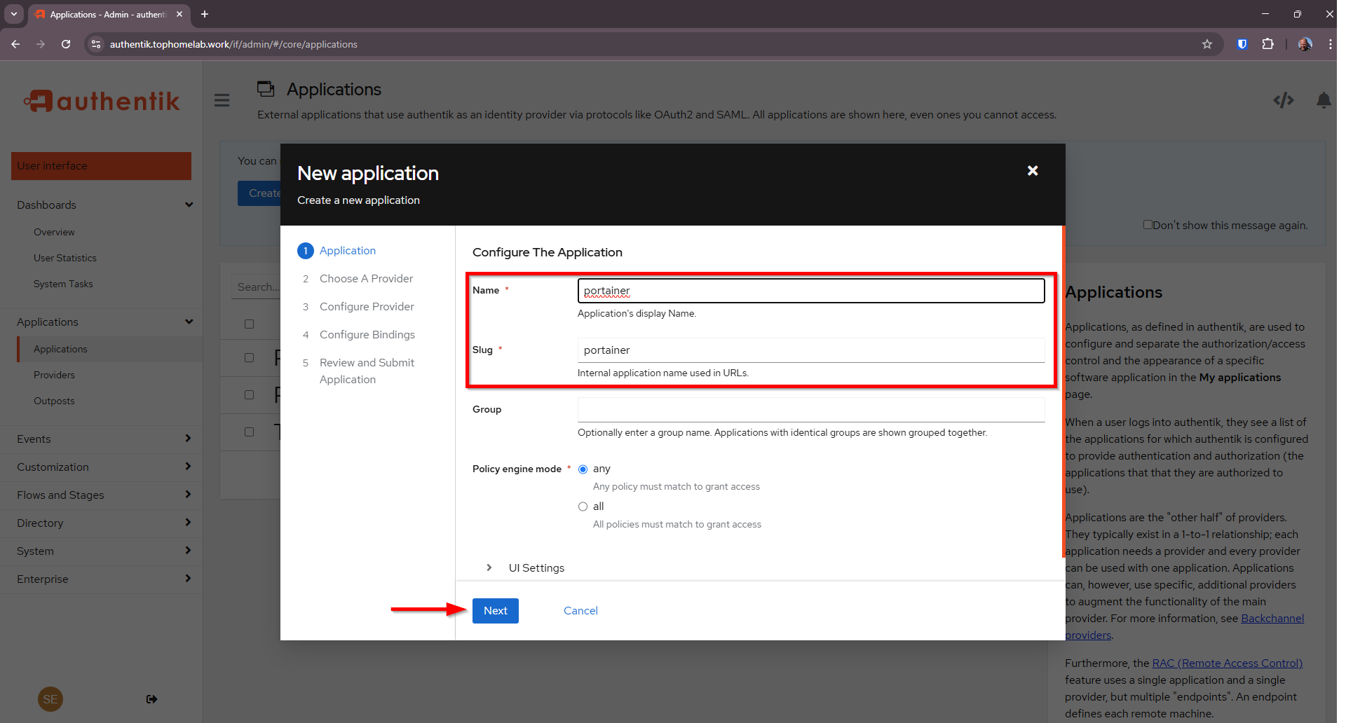 Select Redirect URI (your portainer fully qualified domain name) adn click Next